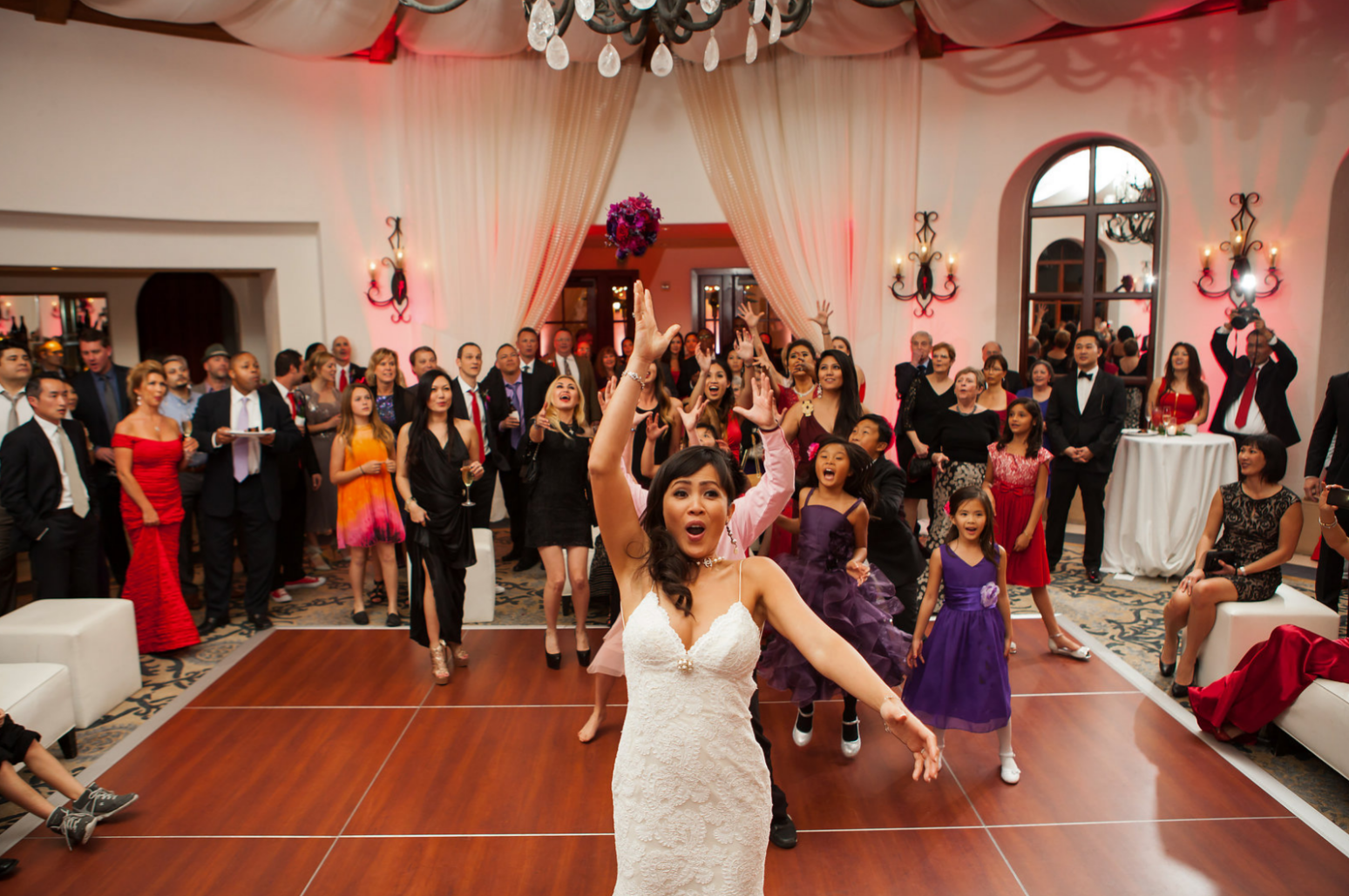 The rotunda at the Bacara Resort & Spa was transformed into a stylish and elegant lounge complete with white leather couches, chandelier and fabric draping hanging from the ceiling courtesy of BAM Speciality Draping. Rose colored uplights from Spark Creative Events gave the room a romantic feel while the stage and dance floor finished the look and gave everyone a feeling of excitement for the fun dance party that would take place later in the evening!
