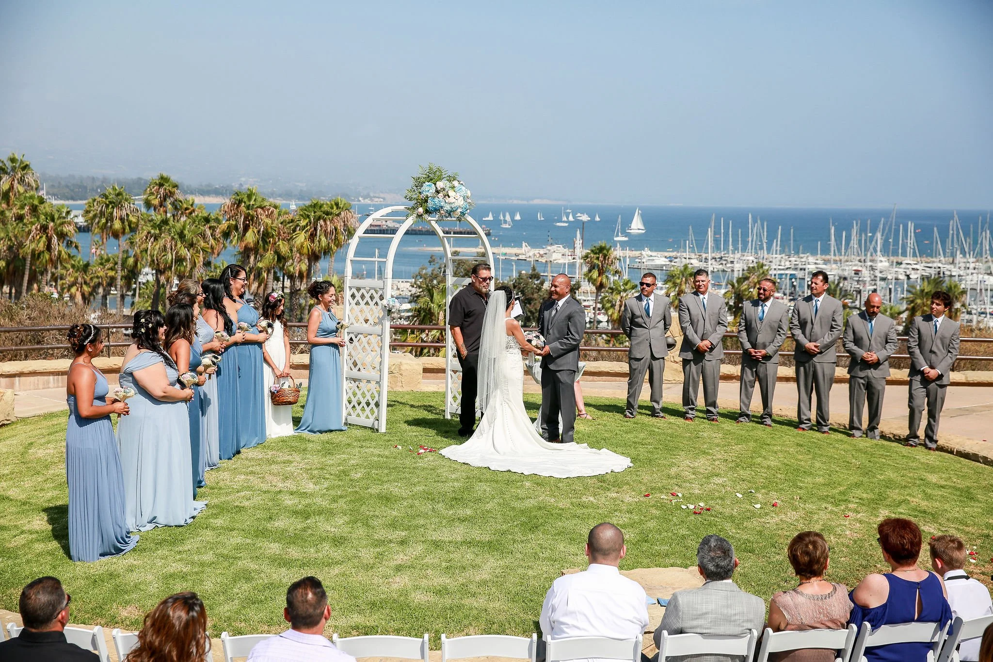 The couple's ceremony was at Santa Barbara City College Maxwell Overlook high above the Santa Barbara Harbor with a picturesque backdrop of palm trees and sailboats. This sunny September day could not have been more perfect for this adorable couple who were surrounded by friends, family and spectacular ocean and mountain views.